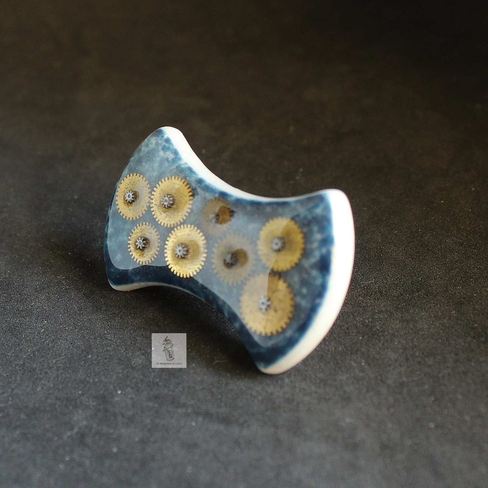 Cette bague est composée d’un carreau de Briare bleu orné d’engrenages véritables.