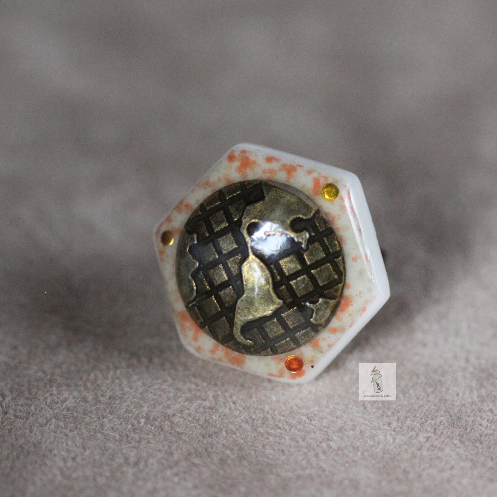Cette bague est composée d’un carreau de Briare orange orné d’une map-monde.
