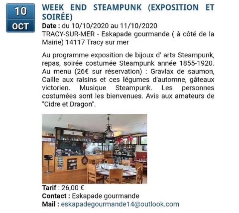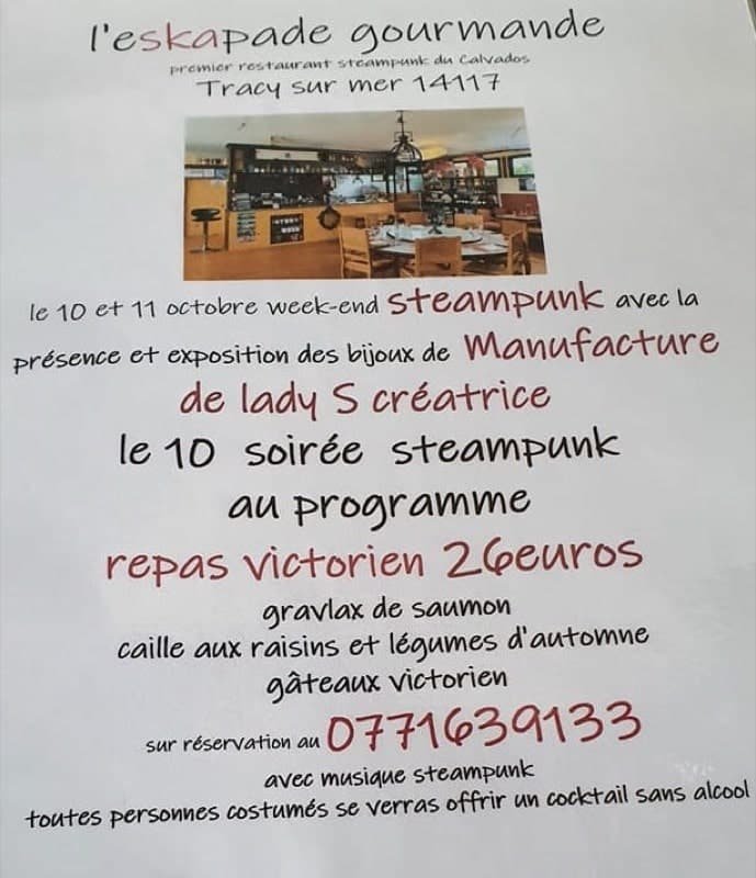 L’Eskapade Gourmande vous propose un week-end Steampunk. Ce restaurant de Tracy-sur-Mer dans le Calvados a refait entièrement sa décoration pour devenir Steampunk.