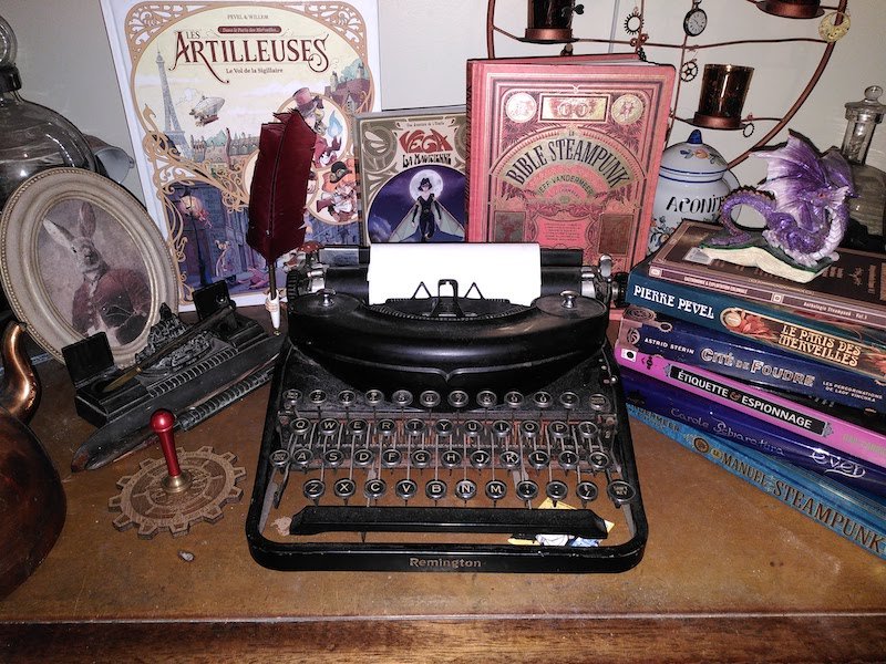 Comme vous pouvez le voir sur cette photo, autour de la machine à écrire, j’ai mis des livres et accessoires d’écriture. (C’est celle de mon cabinet de curiosités, les autres ne sont plus aussi photogéniques.)
