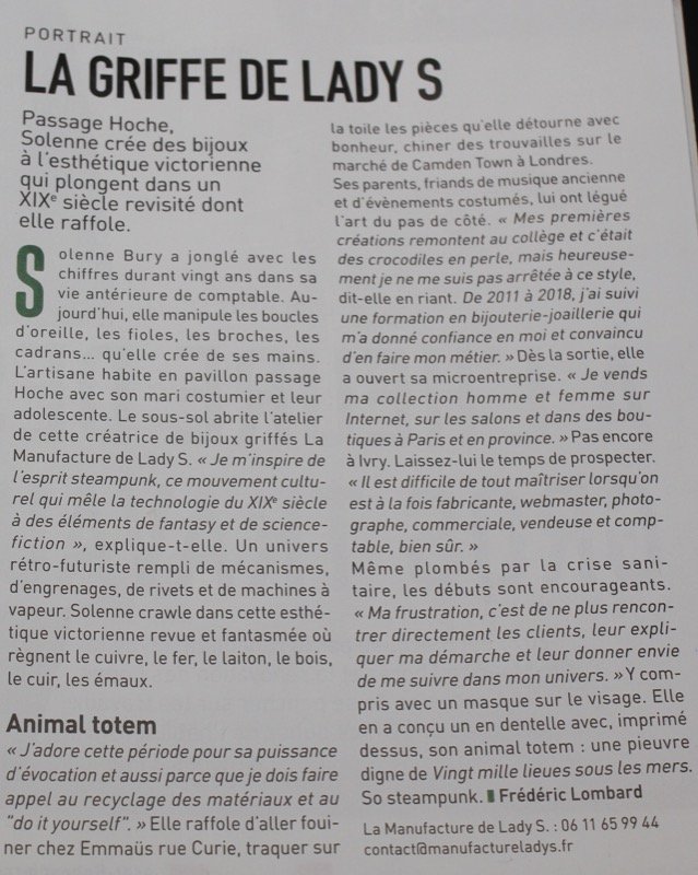 Je suis très contente et fière de cet article de Frédéric Lombard. Il va faire découvrir mon entreprise et le Steampunk à beaucoup d’Ivryens.