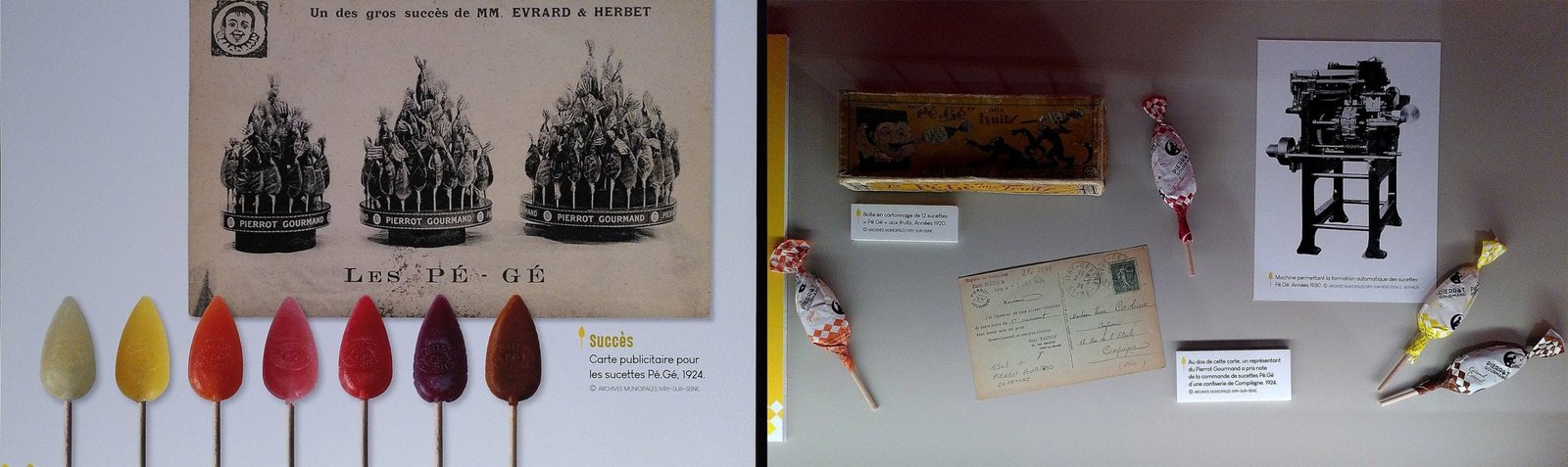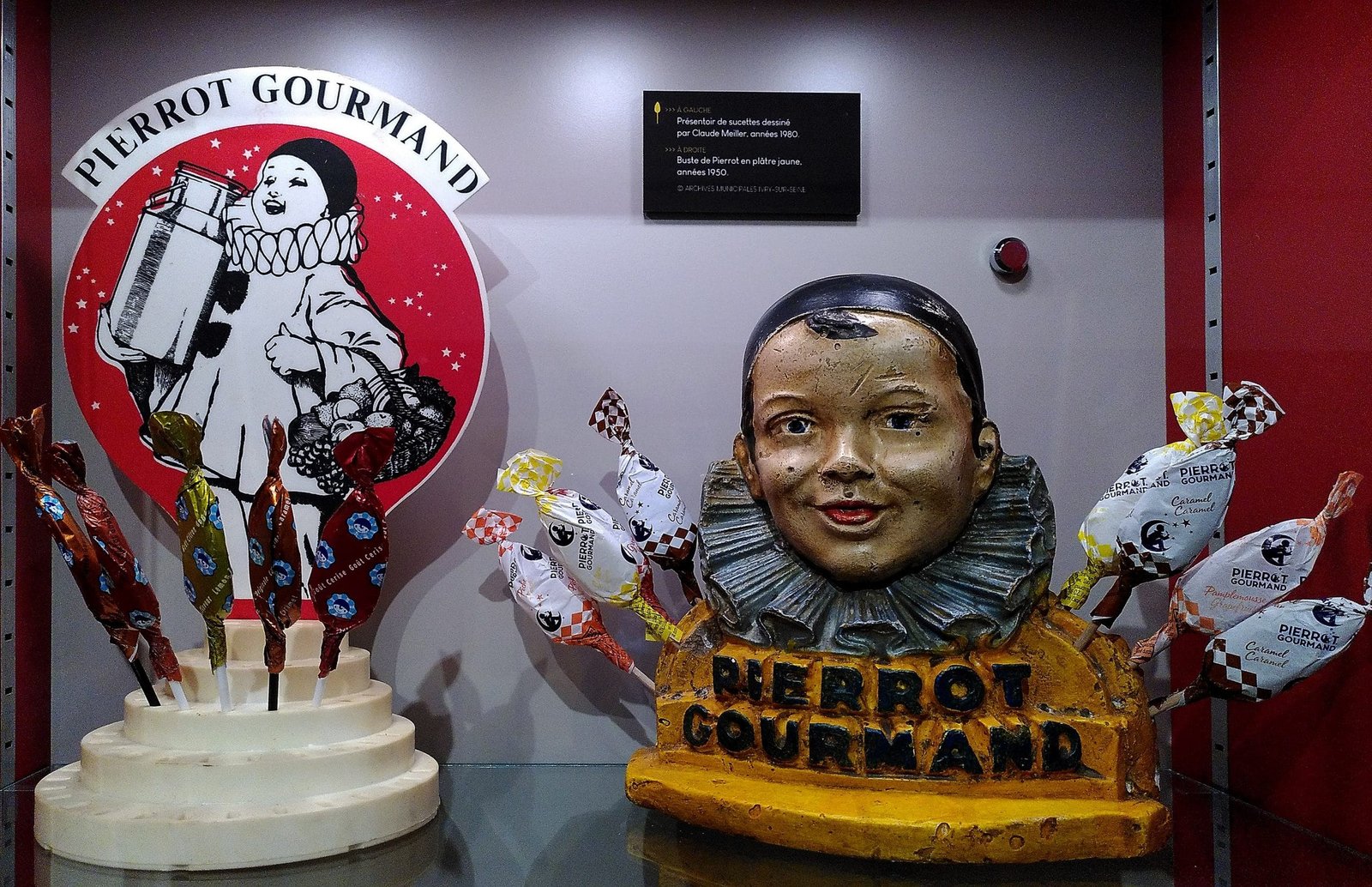 Quand on pense à Pierrot Gourmand, on voit tout de suite le buste de Pierrot rempli des sucettes « Pé-Gé ».