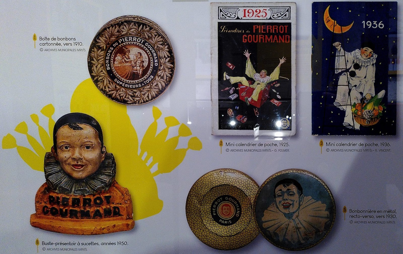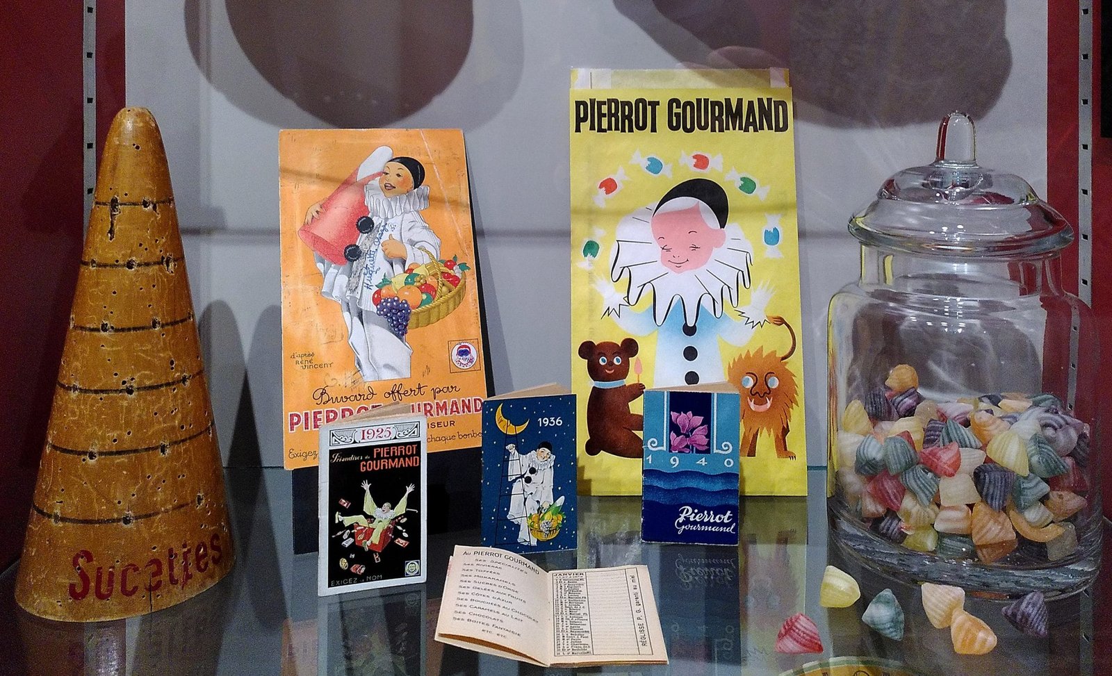 Le buste iconique de Pierrot Gourmand nait dans les années 30. Il remplace le présentoir en forme d’éventail.