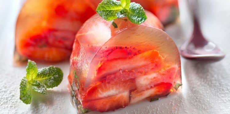 1 – Faites tremper la gélatine dans un bol d’eau froide. Faites bouillir 70 cl d’eau. Faites-y infuser le thé 5 min à couvert avec 4 brins de menthe et le miel. Ajoutez la gélatine essorée en fouettant.