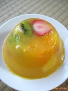 Pour cette recette, il avait été choisi du jus d’orange, et pour les fruits frais du kiwi, de l’ananas, des fraises, des raisins, du melon blanc et de l’orange. Pas besoin de sucre, celui que les fruits contiennent naturellement et celui du jus de fruit plus ou moins artificiel suffisent pour un dessert très frais et nature.