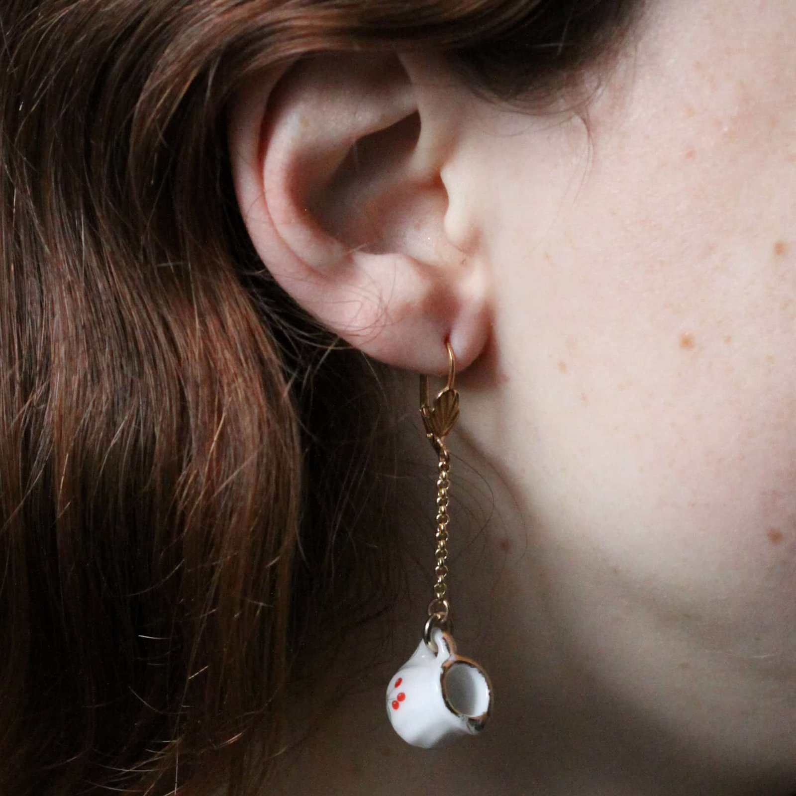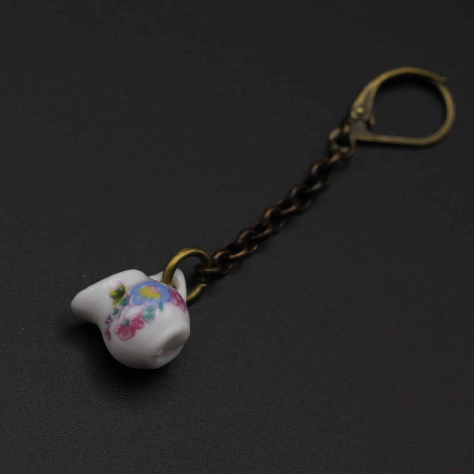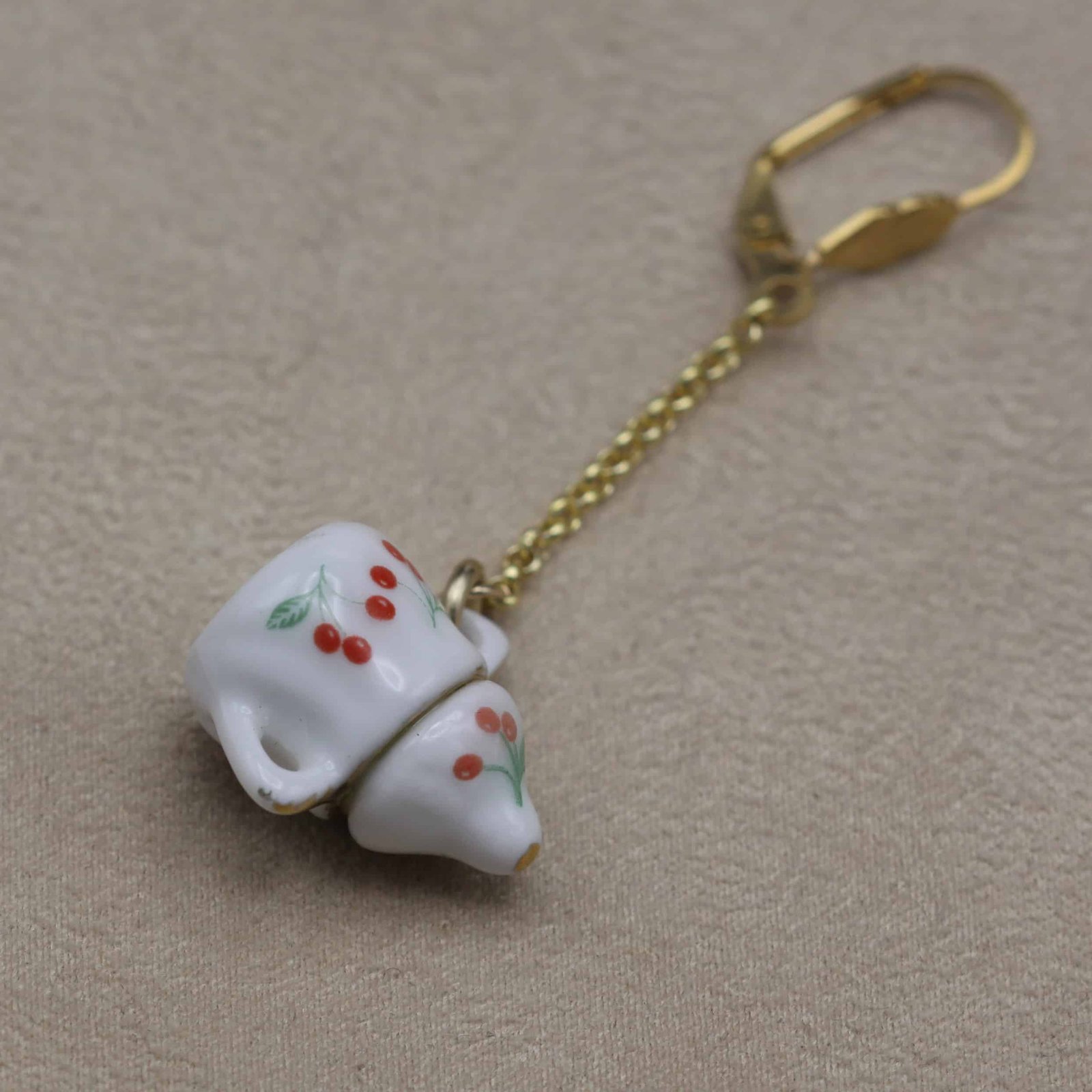 Cette boucle d’oreille est composée d’un pot à lait, d’une assiette à dessert ou d’un sucrier en porcelaine provenant de vaisselle miniature.
