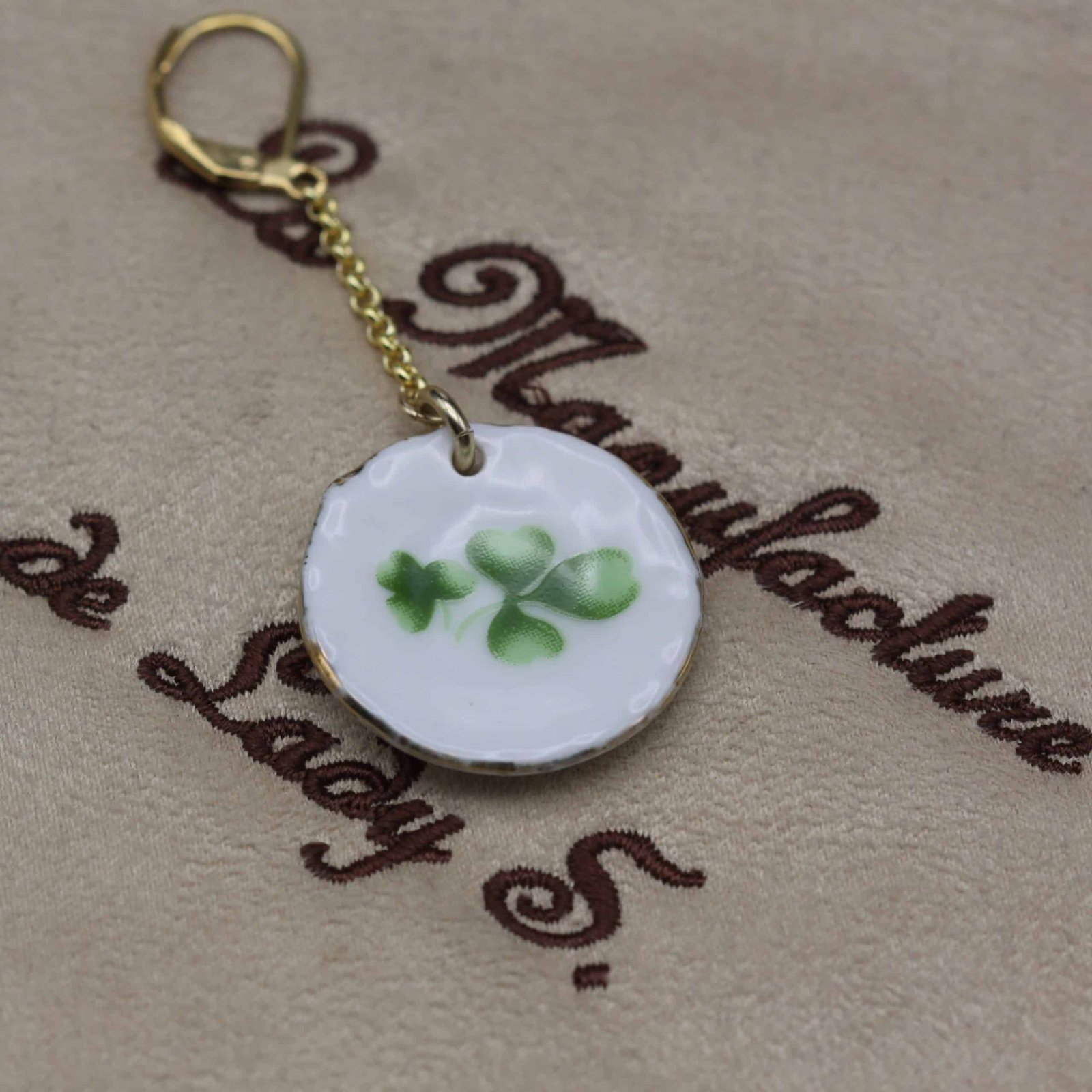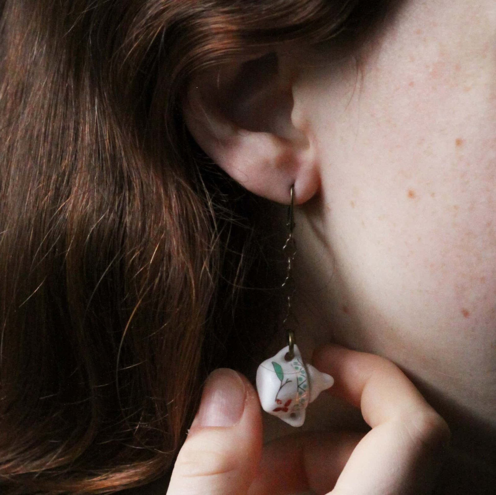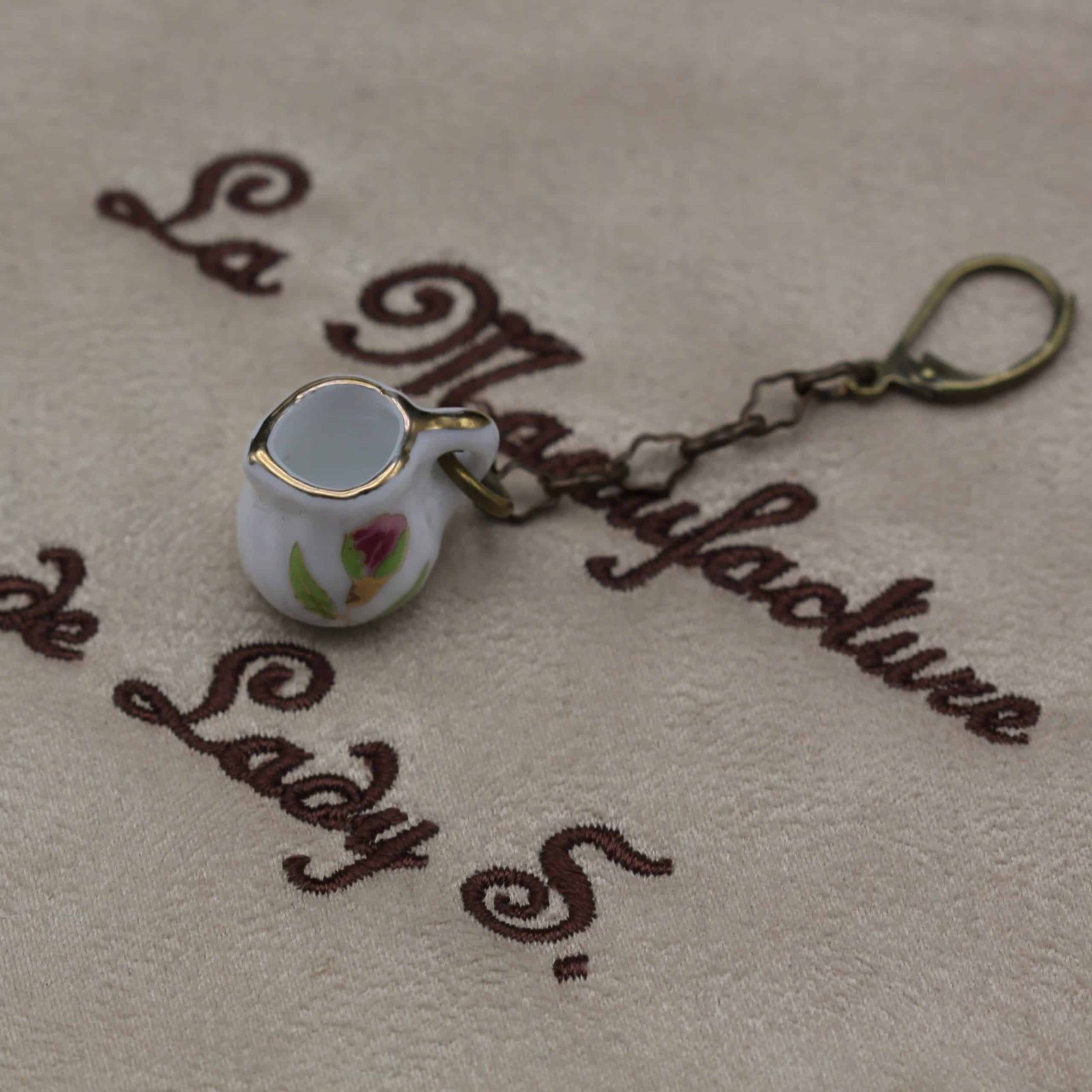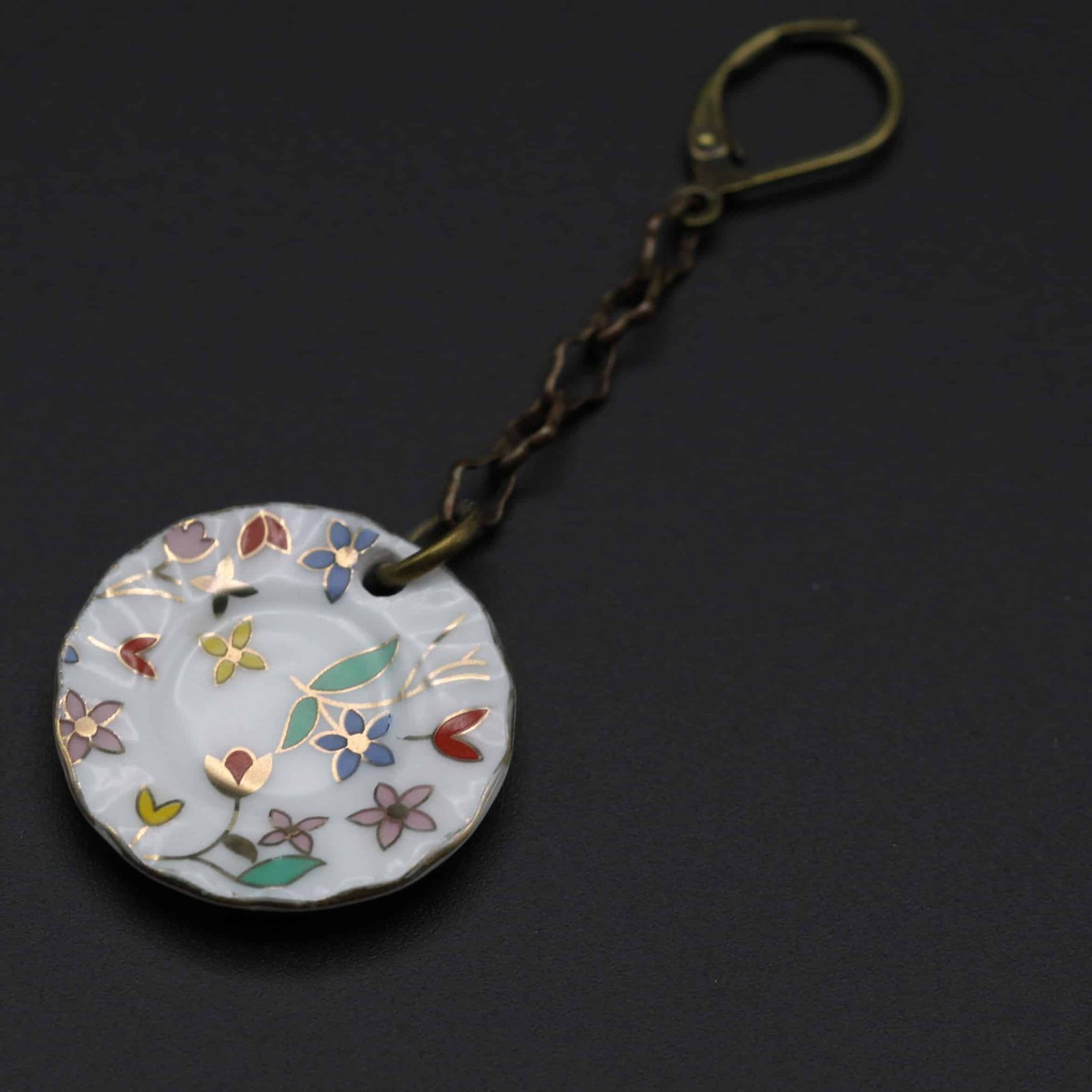 Cette boucle d’oreille est composée d’un pot à lait, d’une assiette à dessert ou d’un sucrier en porcelaine provenant de vaisselle miniature.
