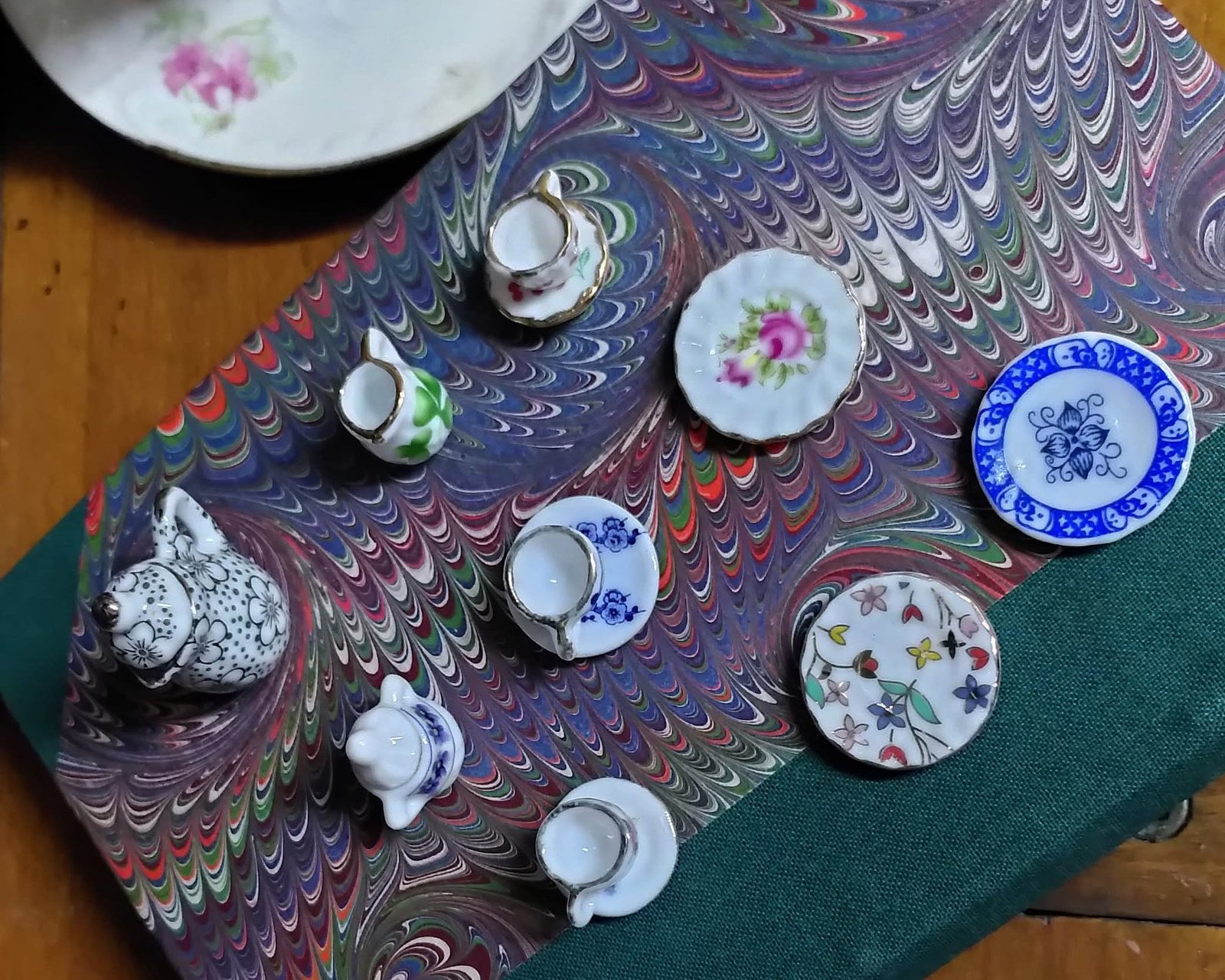- Base : Pot à lait ou assiette à dessert ou sucrier en porcelaine provenant d'un service à thé miniature.