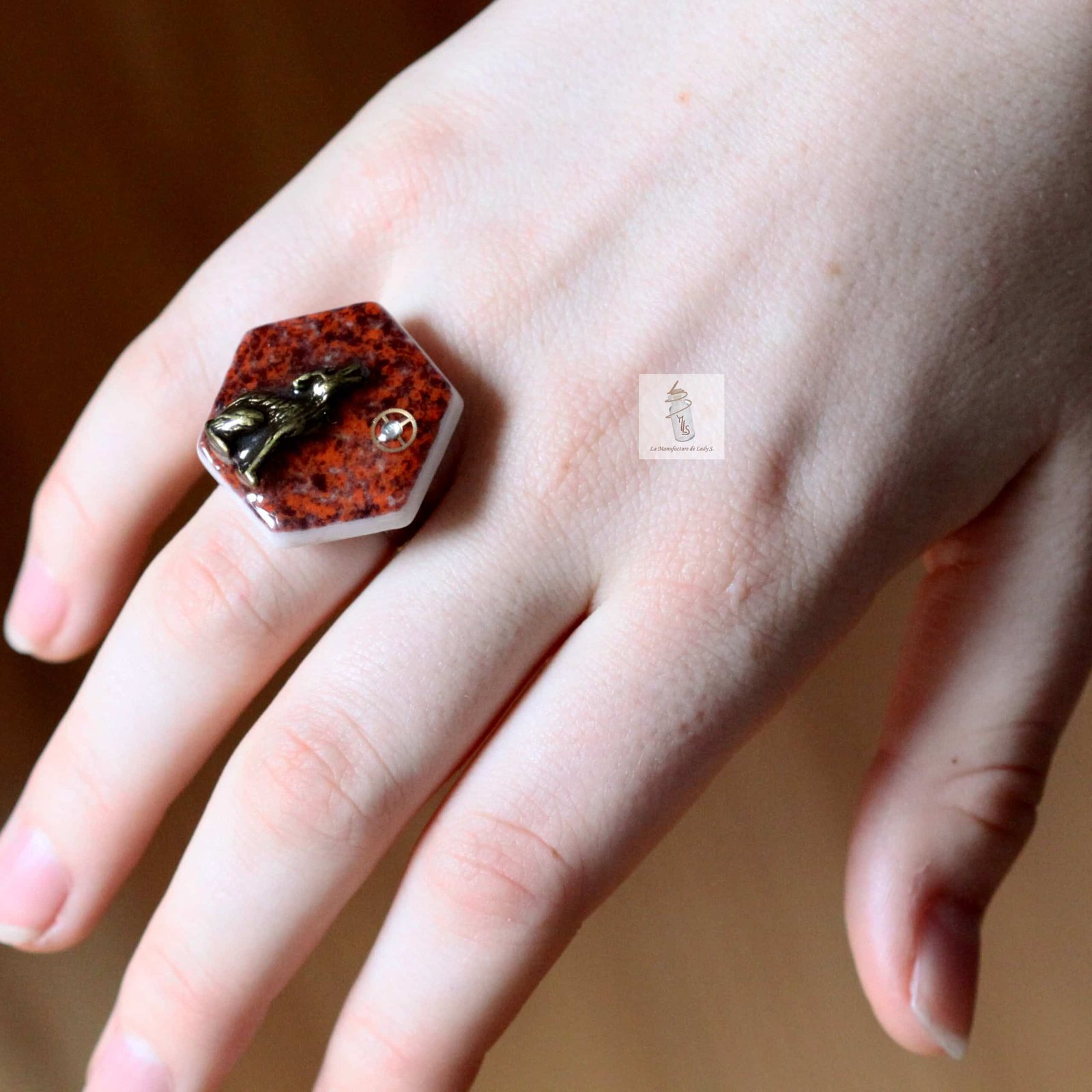 Bague hexagone orange Émaux de Briare Steampunk
