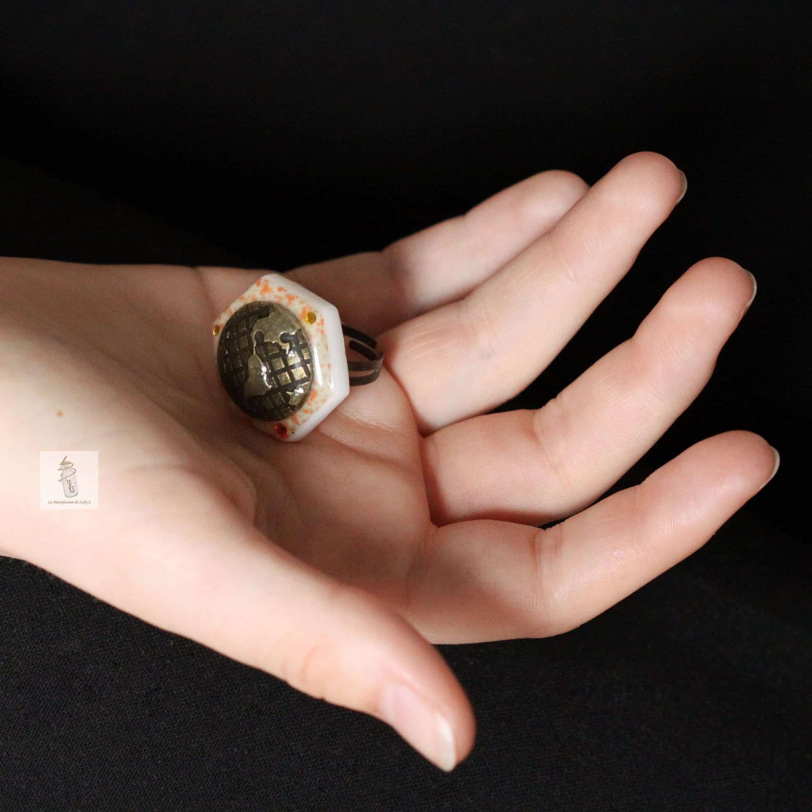 Cette bague est composée d’un carreau de Briare orange orné d’une map-monde.