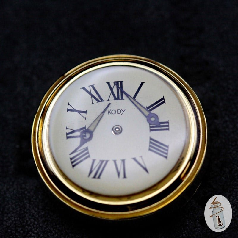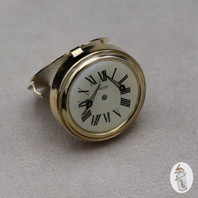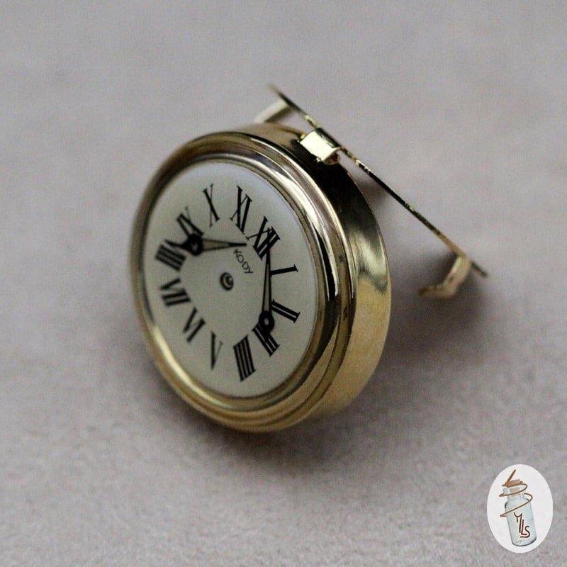 J'ai monté sur un système de cache bouton un véritable cadran de montre rond blanc et doré réhaussé de deux aiguilles.