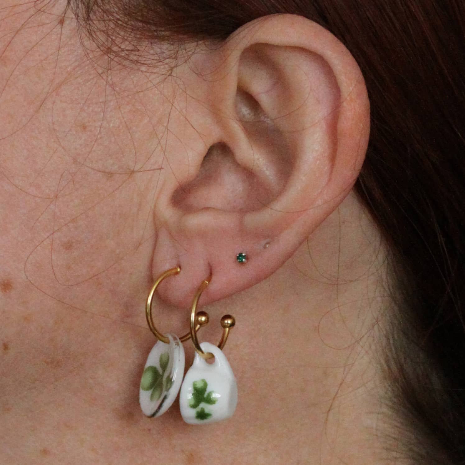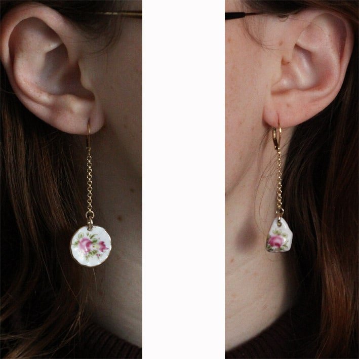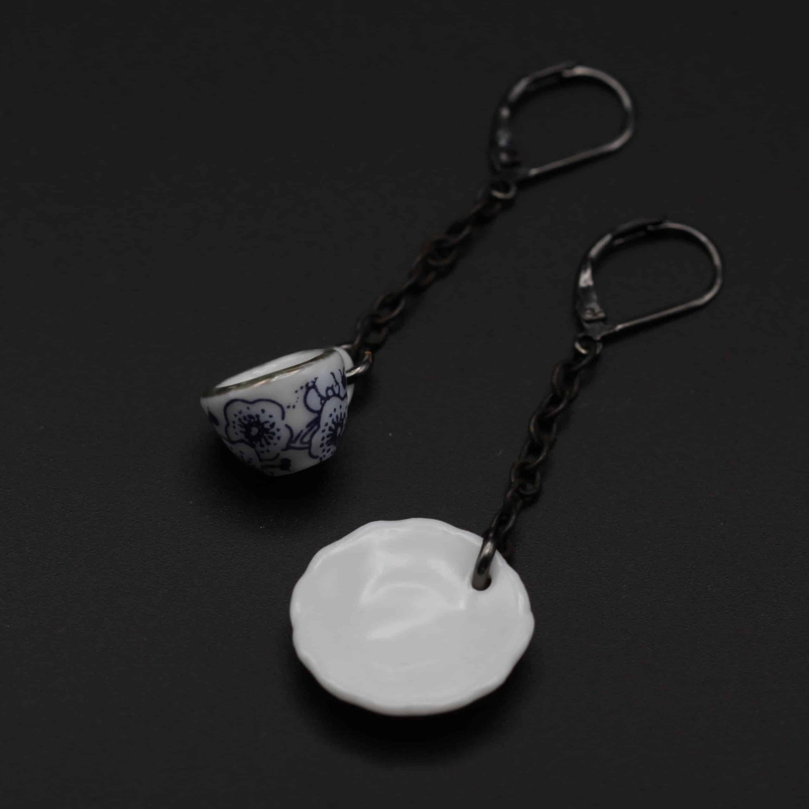 Ces boucles d’oreille dépareillées sont composées d’une soucoupe et d’une tasse en porcelaine provenant de vaisselle de poupée.