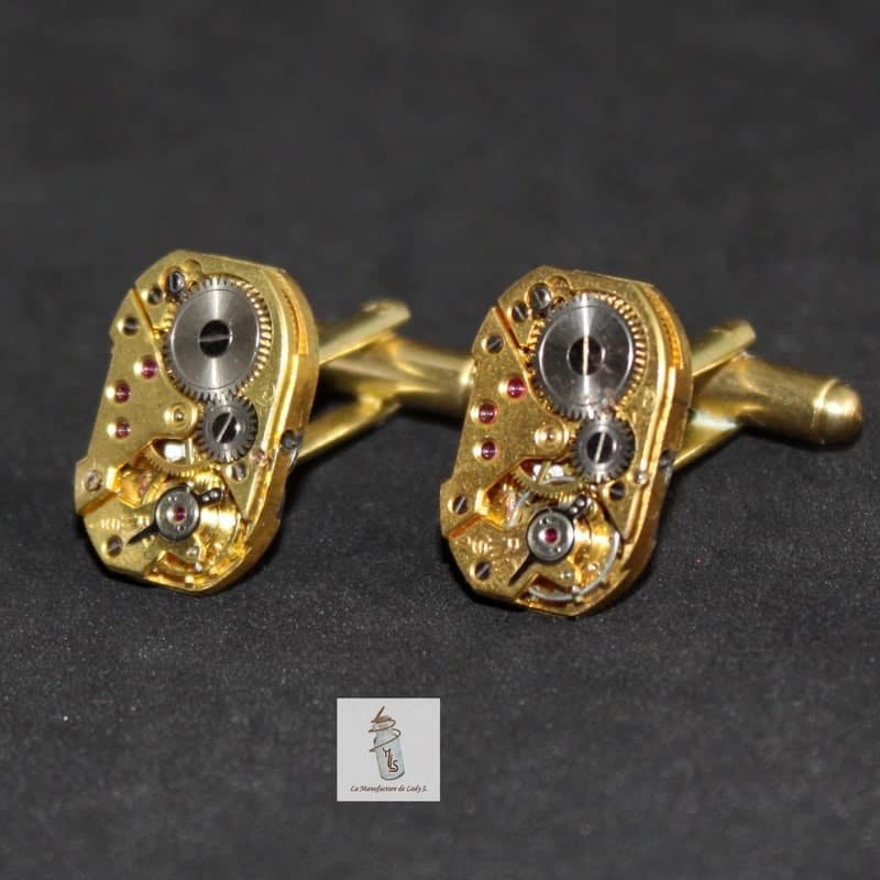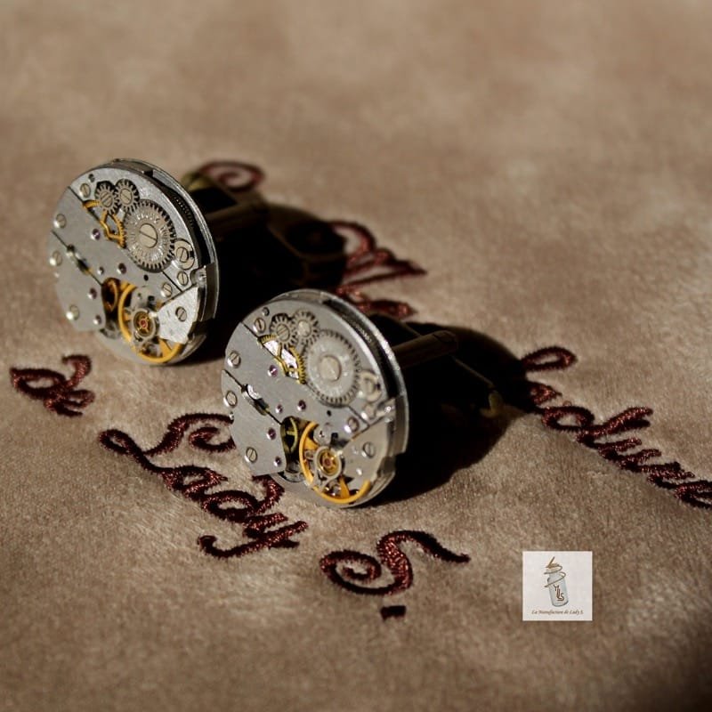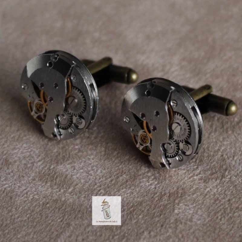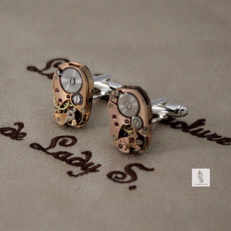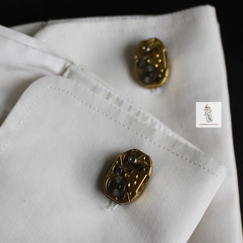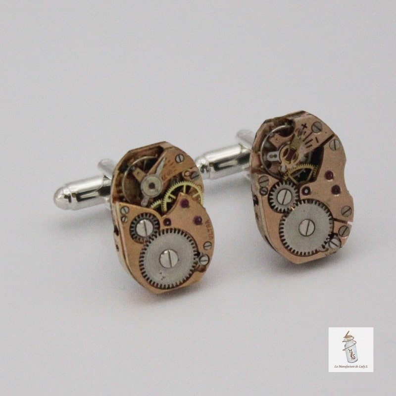 Les mouvements de montre sont un élément phare du courant Steampunk, c’est pour cela que j’ai choisi de les monter en boutons de manchette.
