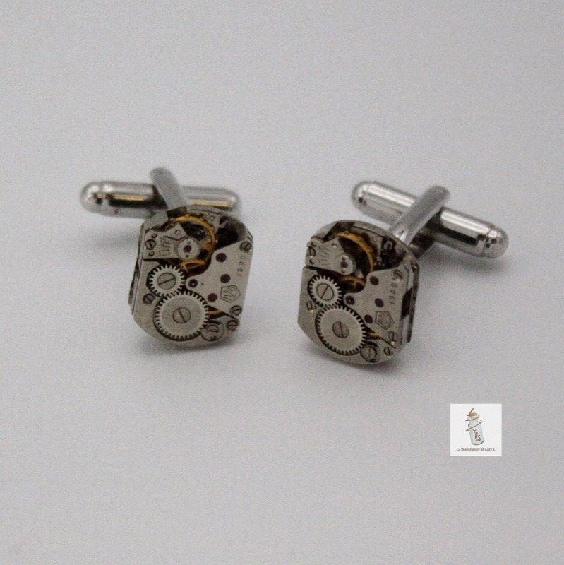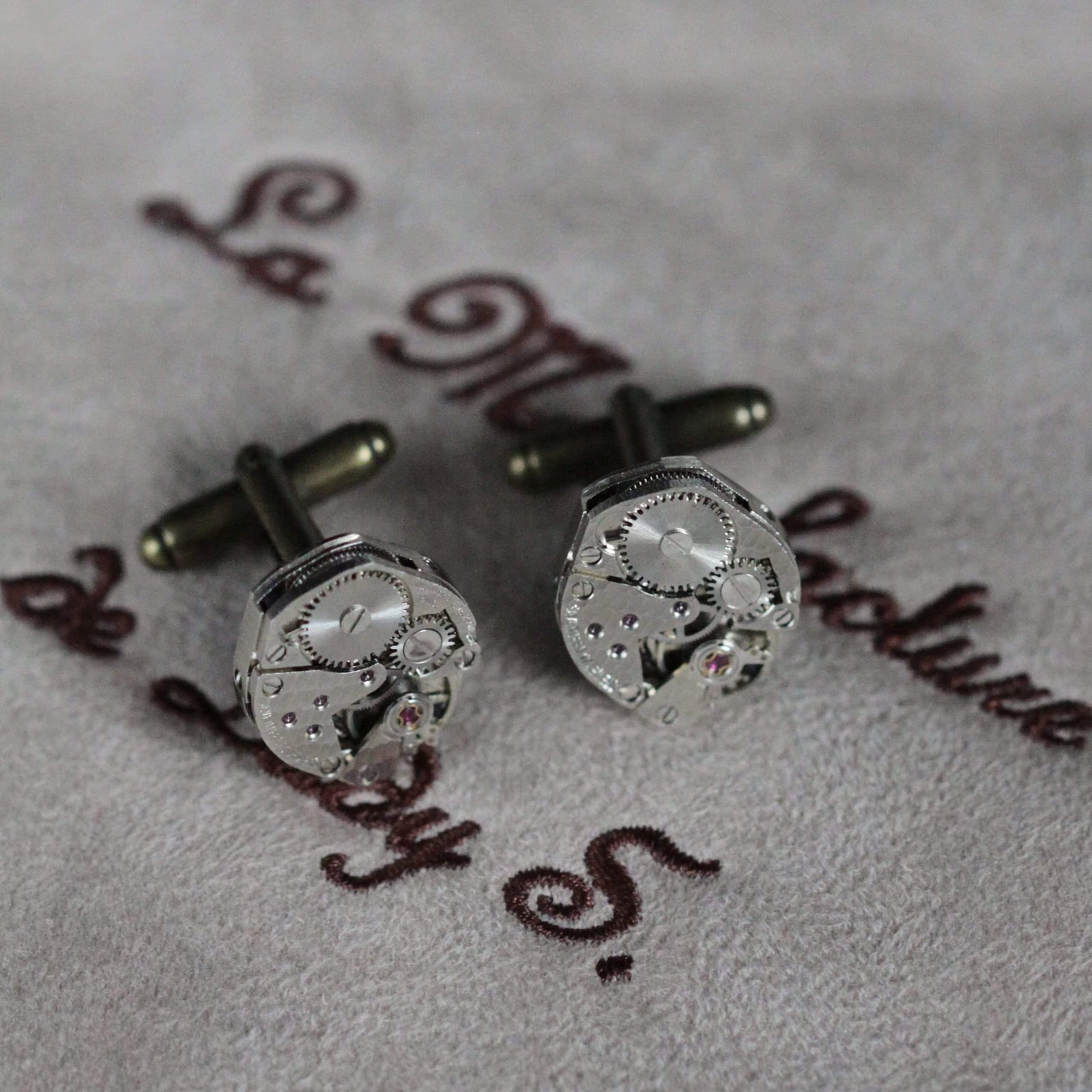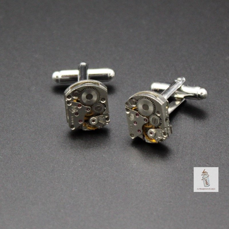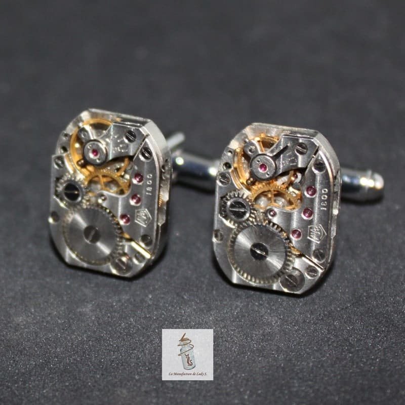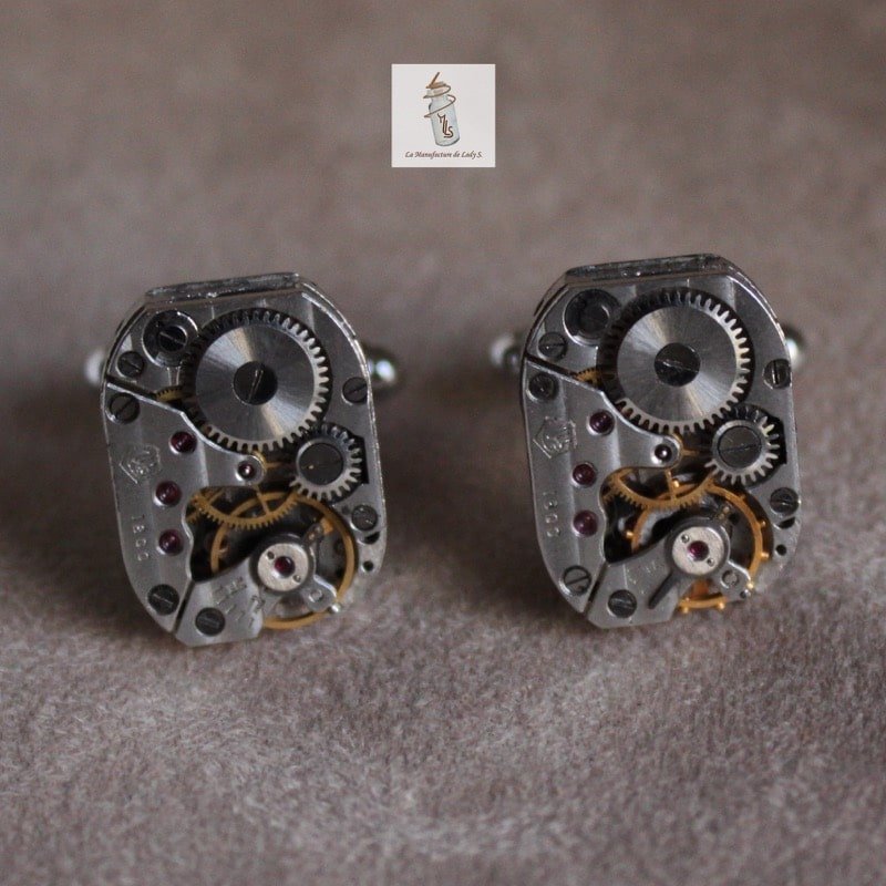 Les mouvements de montre sont un élément phare du courant Steampunk, c’est pour cela que j’ai choisi de les monter en boutons de manchette.