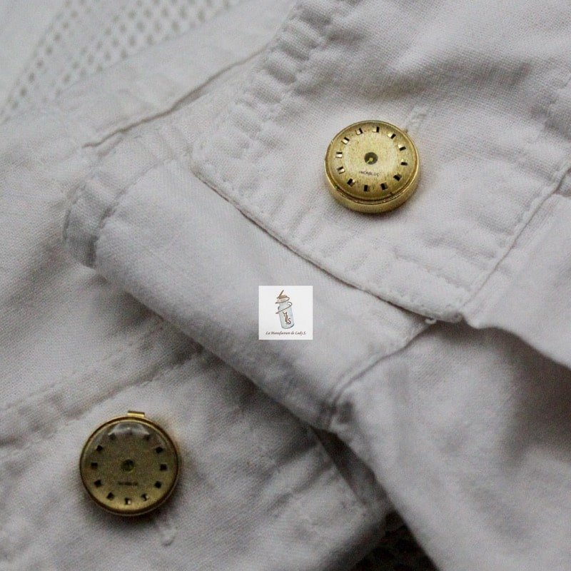 J’ai monté sur des systèmes de caches boutons de véritables cadrans de montre rehaussés de cristaux de Swarovski.